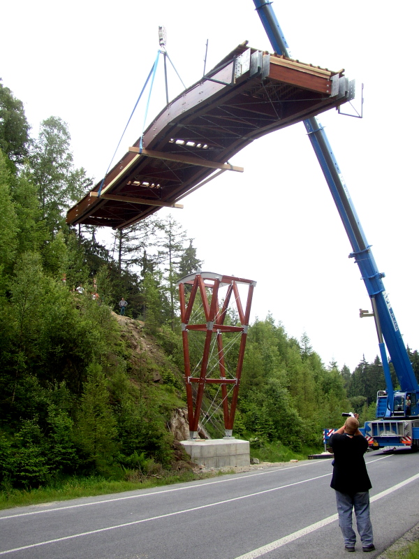 Lávka u obce Rádlo přemosťující silnici č. 65 vedoucí z Liberce do Jablonce nad Nisou bylo dodávána pro generálního dodavatele a to spol. STAVBY SILNIC A ŽELEZNIC, a.s., odštěpný závod Liberec. Hlavní nosníky lávky jsou z lepeného lamelového dřeva ve tvaru řetězovky a z lepených dřevěných příčníků. Dřevěná konstrukce je podporována dvojicí nosných lan kotvených do skalního masivu a středním pilířem ve formě kyvné stojky. Vlastní tíhou nosné konstrukce jsou lana napnuta a zformována do tvaru řetězovky. Délka mostu: 58,5 m, šířka mostovky: 3,8 m a výška nad silnicí: 9,5 m.